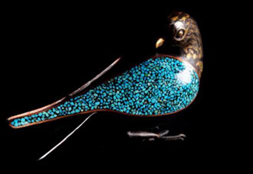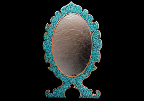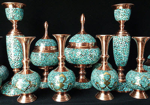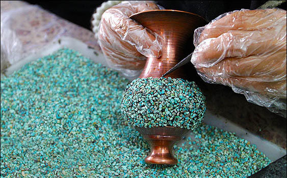 ب) فیروزه کوبی: قبل از هر چیز صنعتگر فیروزه کوب خرده سنگهای فیروزه ی غیر قابل استفاده را از کارگاههای فیروزه تراشی و یا معادن فیروزه ی مشهد، نیشابور و دامغان خریداری می نماید.از آنجا که این خرده سنگها با مقادیری خاک و خرده سنگهای معمولی همراه می باشد ابتدا آنها را از ضایعات دیگر جدا و تمیز می نمایند. سپس خرده سنگهای فیرروزه را بر حسب اندازه از یکدیگر تفکیک و باصطلاح دانه بندی می کنند تا در ساخت هر محصول فیروزه کوب از قطعه فیروزه یی متناسب تر با سطح کار فیروزه کوبی استفاده بعمل آید.در مرحله ی بعد شیئی مورد نظر را گرم کرده (در حدود ۳۰ درجه C) و ضمن حرارت دادن روی قسمتهایی که باید فیروزه کوبی گردد «لاک گردوئی» می پاشند بقسمتی که پودر لاک تقریباً ذوب شده و سطح قسمت مربوطه را بپوشاند.در حالیکه هنوز لاک بر سطح شیئی نرم و مذاب بوده و حالت چسبندگی دارد مقداری از خرده سنگ های فیروزه که بر حسب اندازه ی لازم از قبل آماده شده روی کار قرار می دهند. سنگها باید طوری در کنار هم قرار گیرند که حتی الامکان فاصله یی بین آنها باقی نماند.